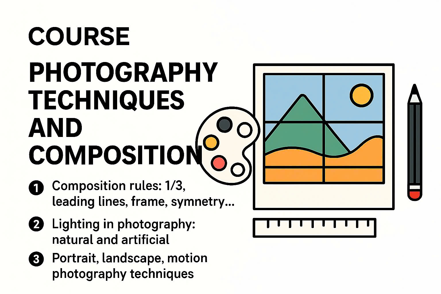 Khóa học bố cục ảnh thường đi sâu vào các nguyên tắc và kỹ thuật sắp xếp các yếu tố trong khung hình để tạo sự hài hòa, cân bằng và hấp dẫn thị giác. Nội dung cơ bản thường bao gồm: